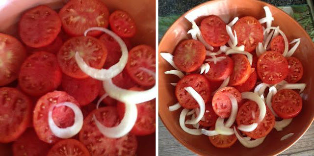 1. Cortar a Tomate as rodelas com espessura de 1 cm, e colocar numa saladeira;